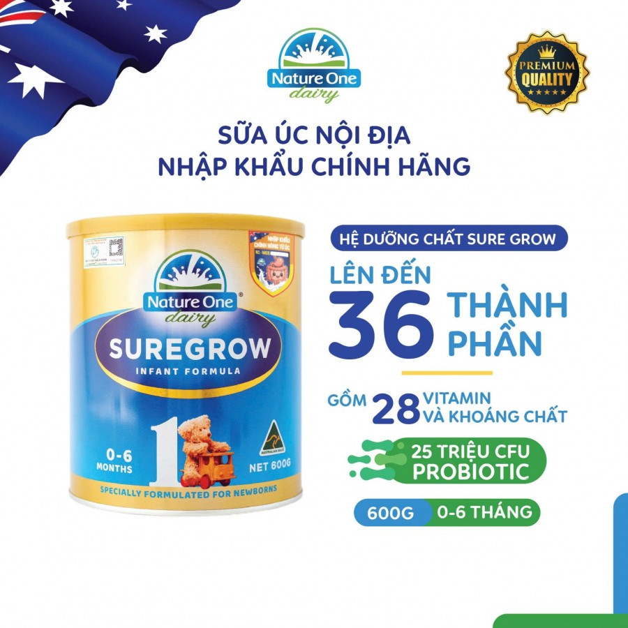 Mô tả: Nature One Dairy Sure Grow 1 là sữa công thức cho bé từ 0-6 tháng tuổi với hệ dưỡng chất lên tới 36 thành phần, trong đó có 28 vitamin và khoáng chất cùng lợi khuẩn.
